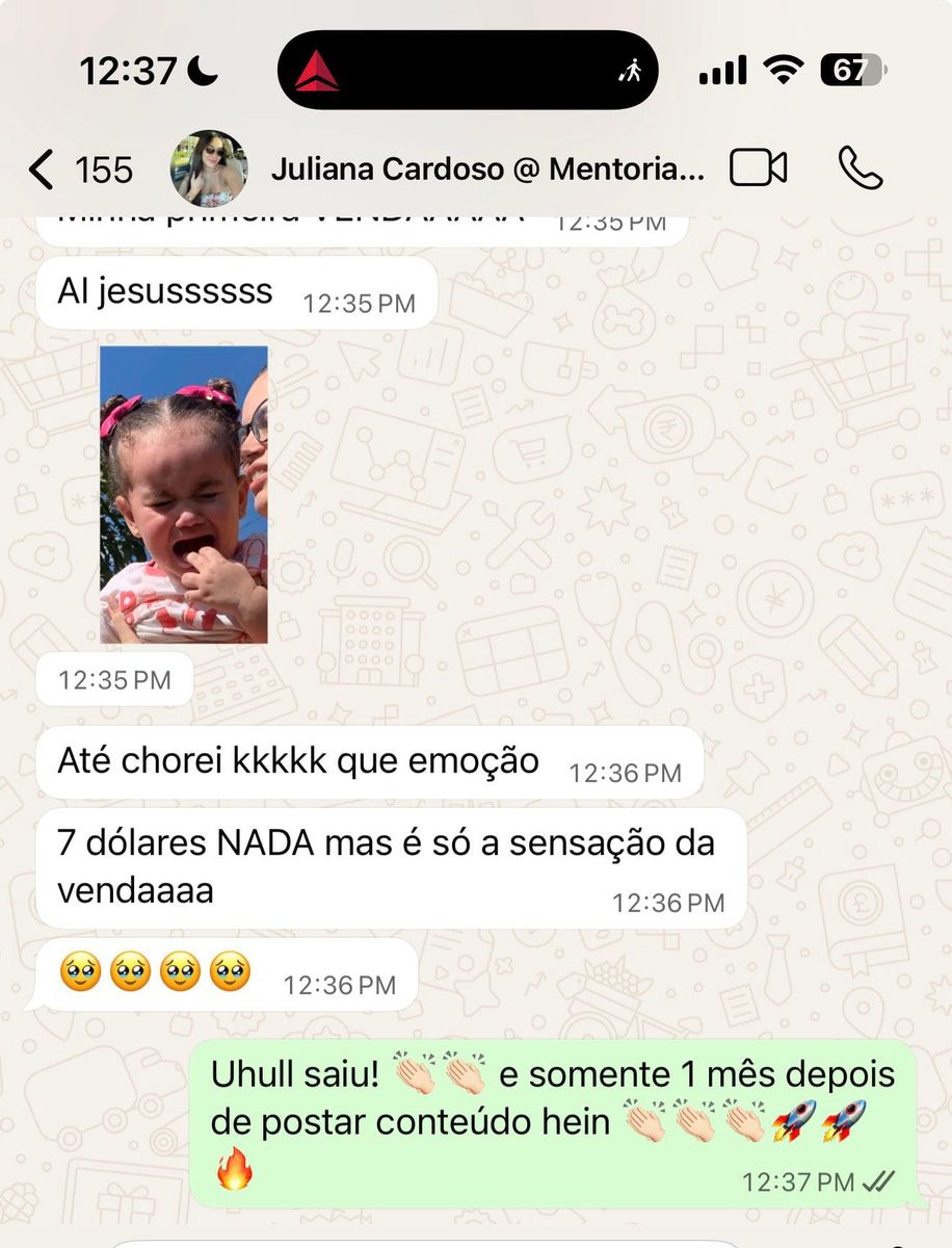 Juliana fez sua primeira venda em apenas 1 mês postando conteúdo — começou com $7 e não parou mais.