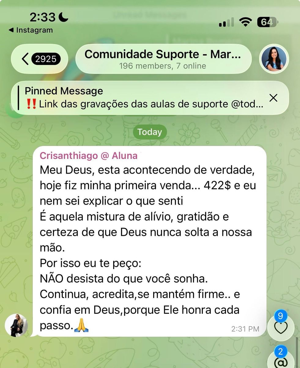 A Marina acompanha as alunas do Start Digital em Dólar em um grupo de suporte exclusivo — onde ela responde pessoalmente as dúvidas, corrige o caminho e garante que você chegue nos seus primeiros resultados em dólar.